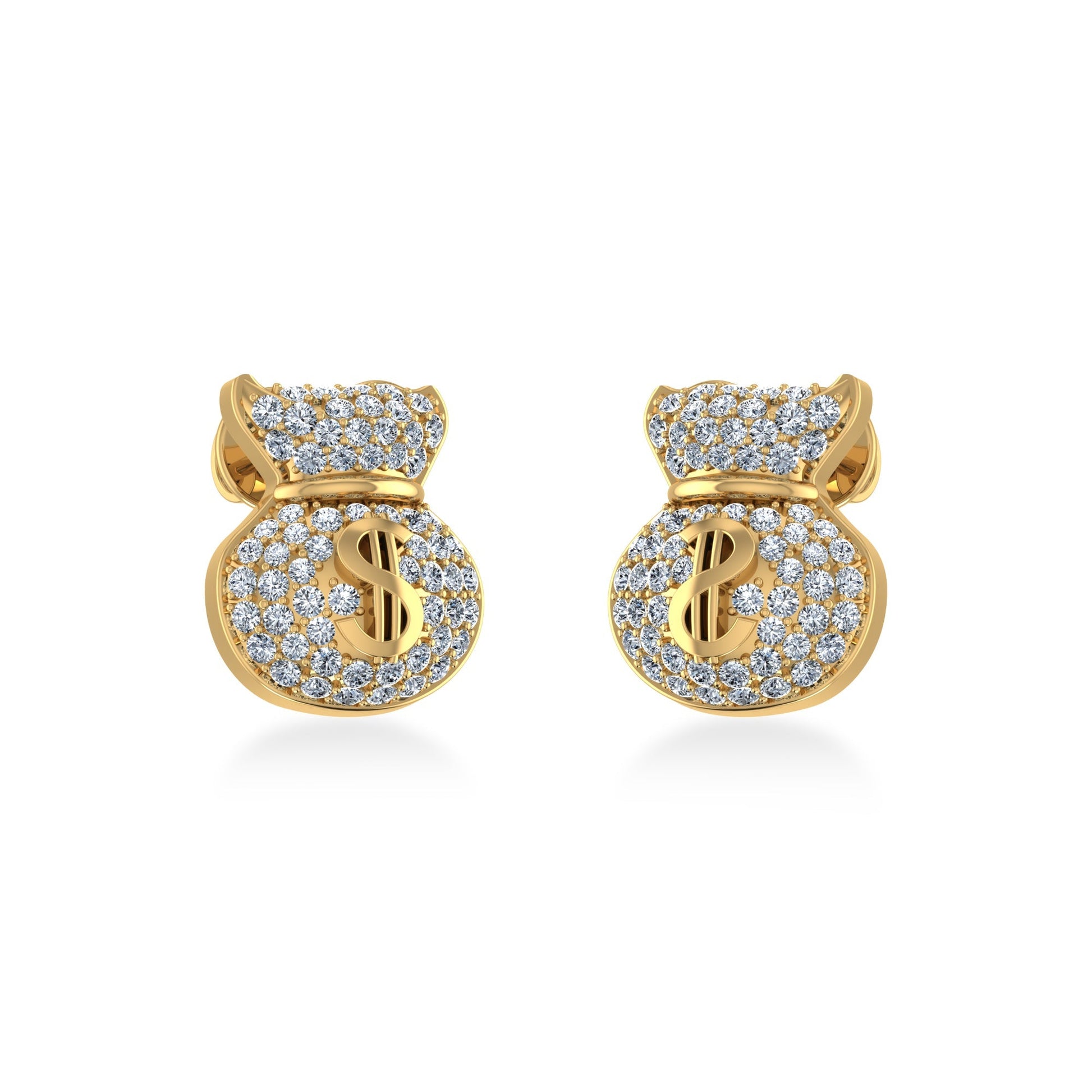 14K Yellow Gold Round Diamond Money Dollar Bag Designer Stud Earrings 1/6 Cttw