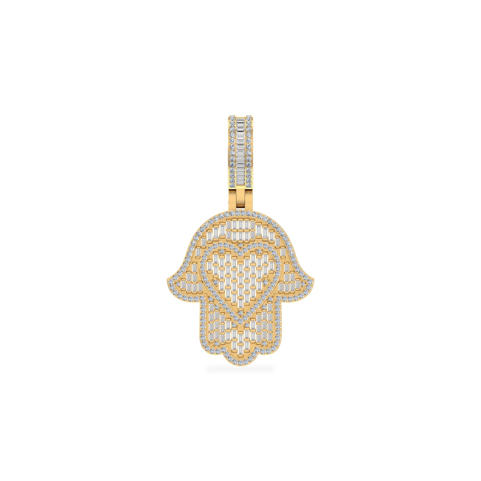 10K Yellow Gold Round Baguette Diamond Heart Hamza Hand Religious Charm Pendant 1-3/4 Cttw