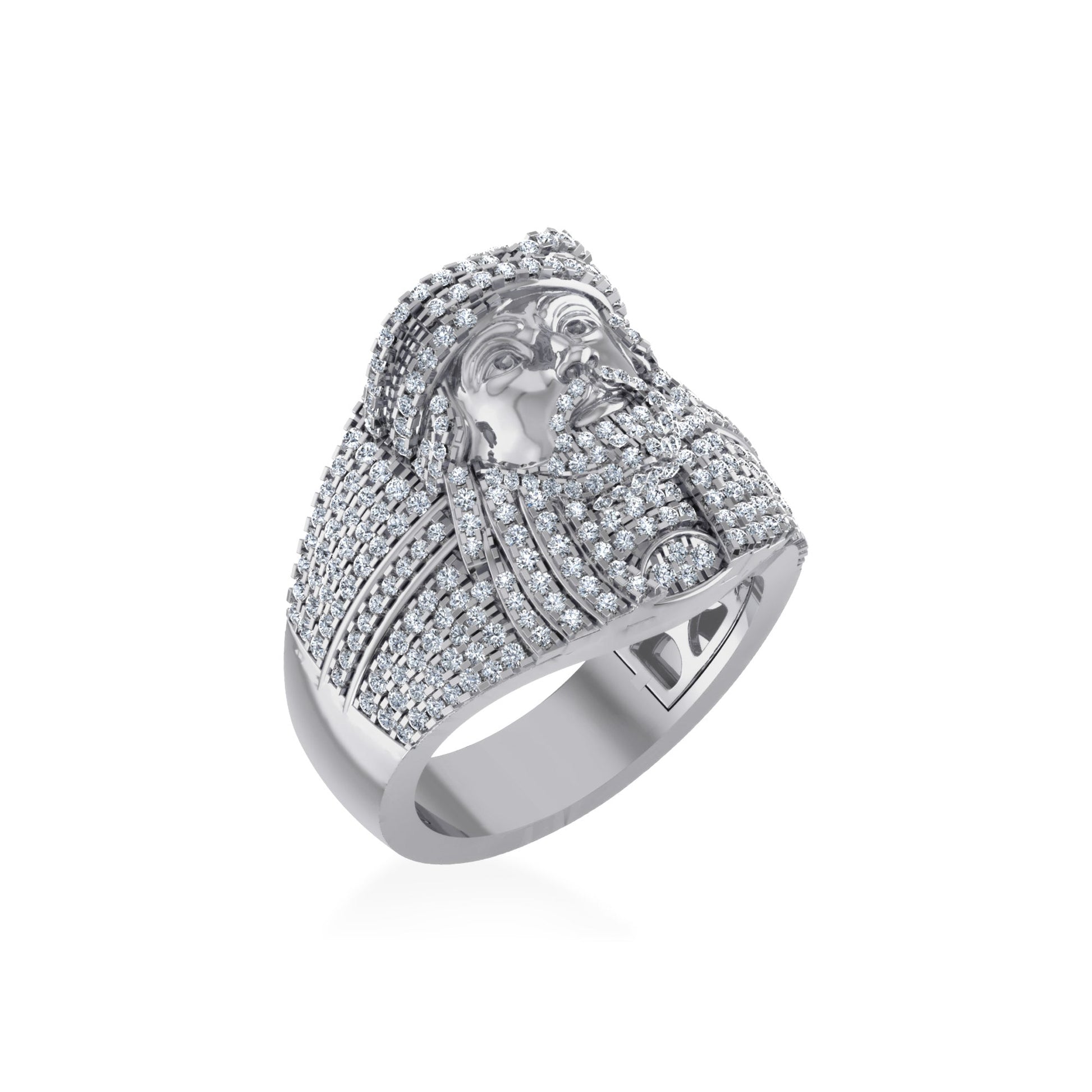 10K White Gold Round Diamond 3D Jesus Religious SZ 10 Mens Ring 1-3/4 Cttw
