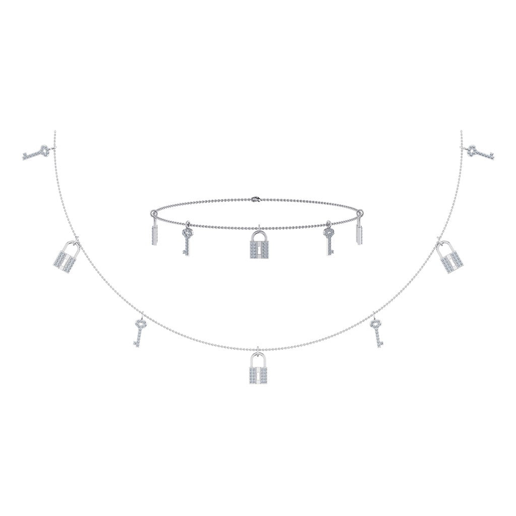 14K White Gold Lock & Key Link Necklace Bracelet Jewelry Set 1/2 Cttw