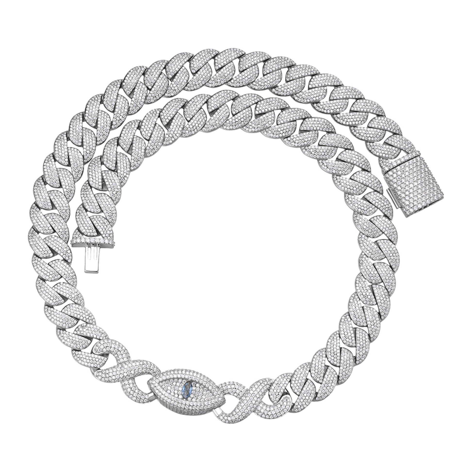 S.Silver Round Moissanite 15mm Inifinity Cuban With Evil Eye Designer 22 Inch Mens Necklace RP 35-3/4 Cttw