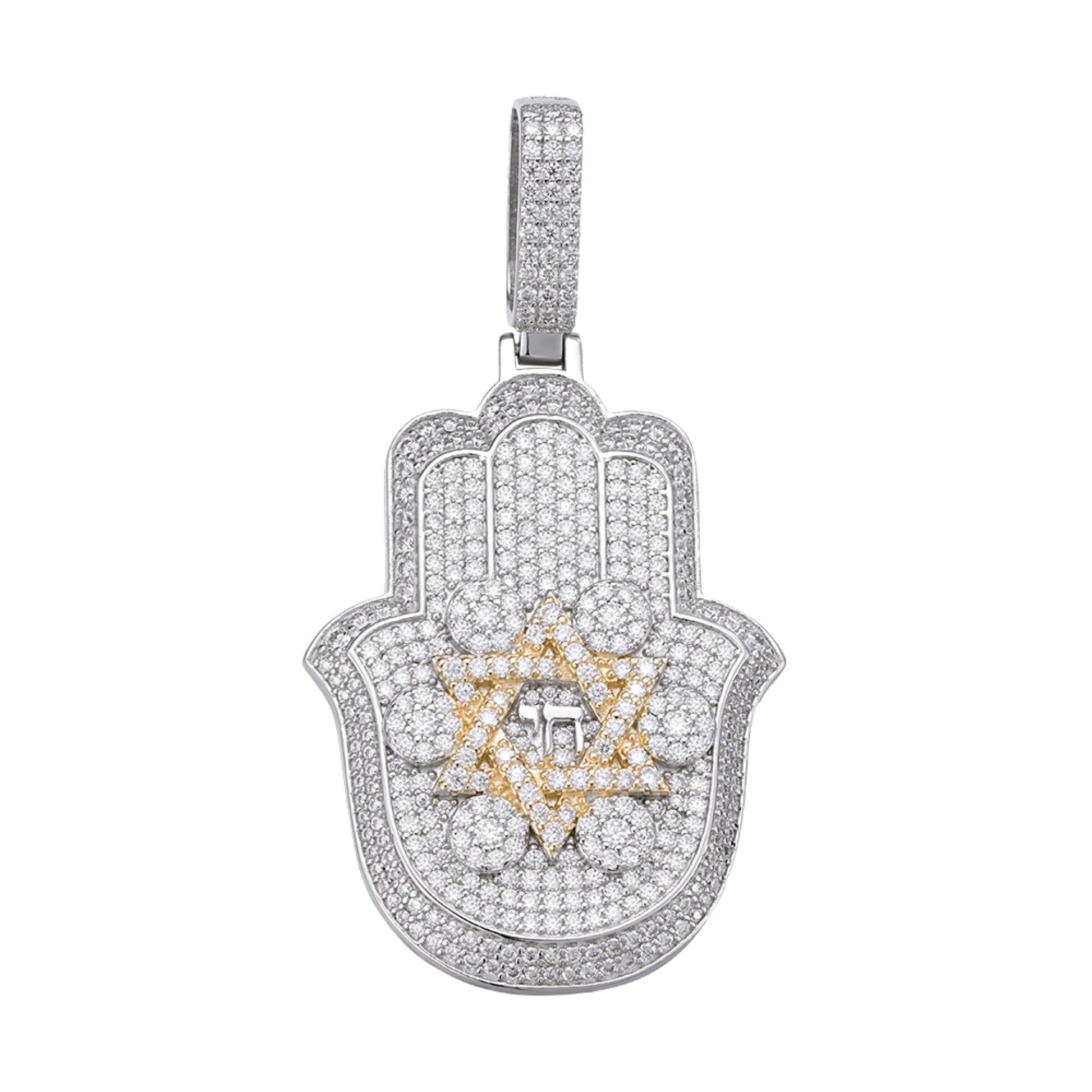 S.Silver Round Moissanite Hamza Hand Religious Pendant RP+GP 3-5/8 Cttw