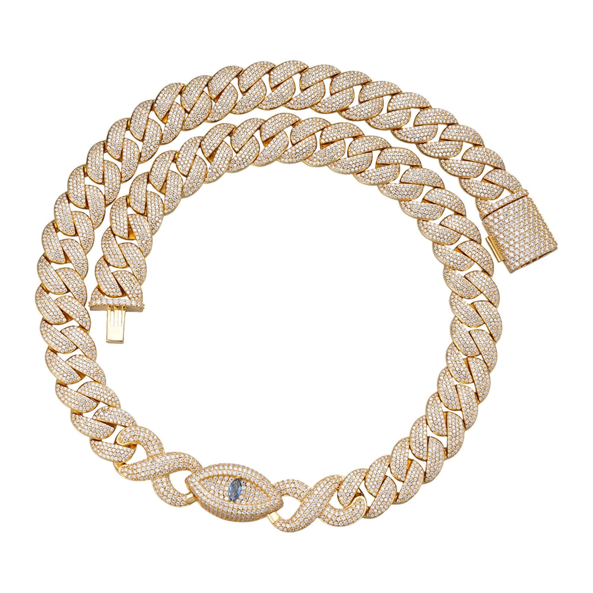 S.Silver Round Moissanite 15mm Inifinity Cuban With Evil Eye Designer 22 Inch Mens Necklace GP 27-1/8 Cttw